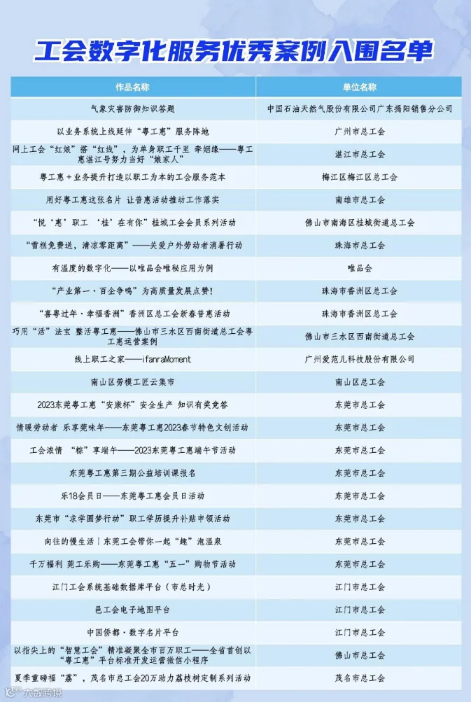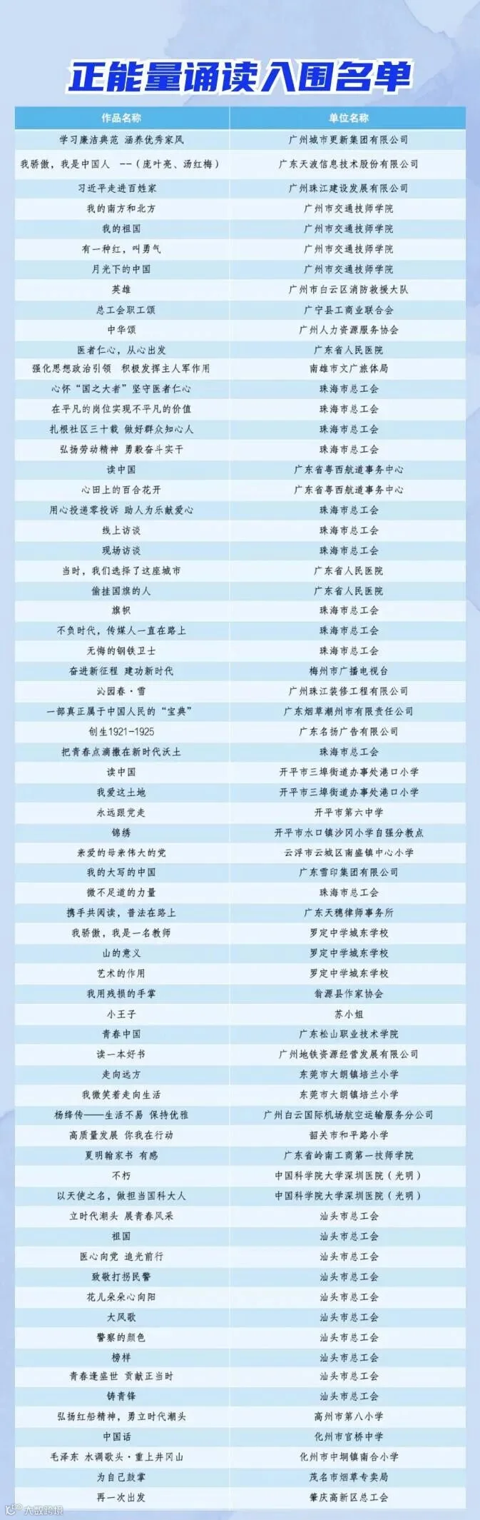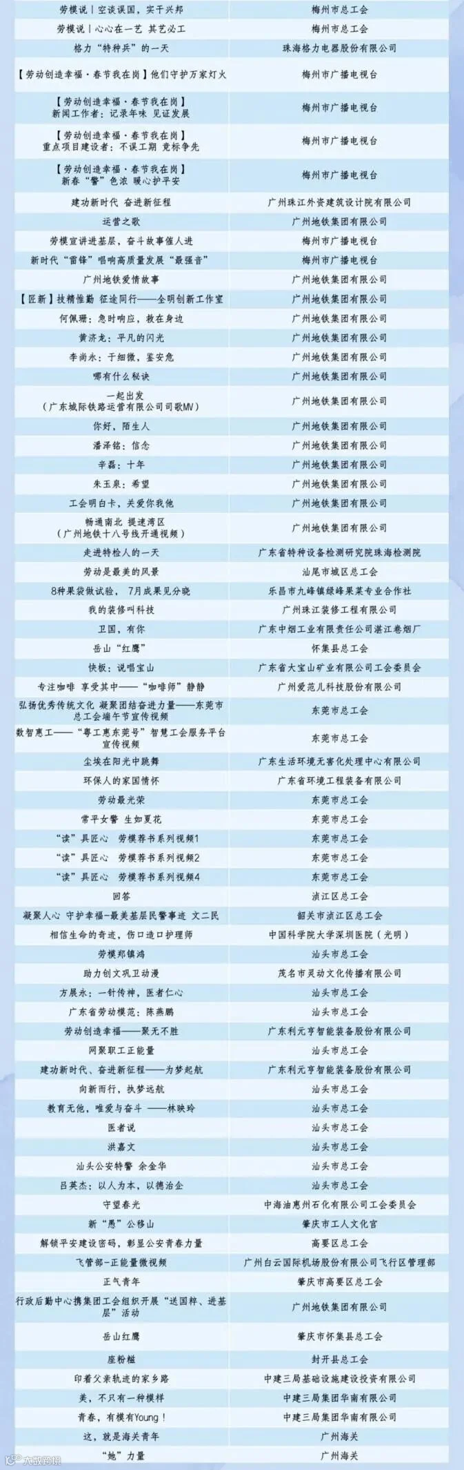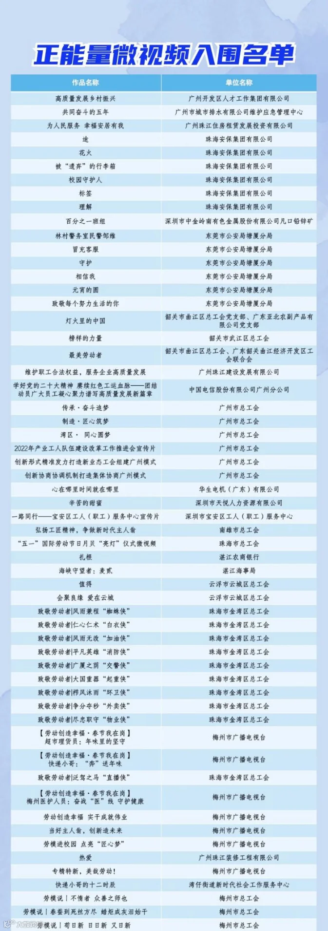 日前,广东省总工会、广东省委网信办联合开展2023年“网聚职工正能量 争做南粤好网民”主题活动,面向广东网民征集展现当代职工精神风貌、传播网络正能量的正能量歌曲、诵读、微视频和工会数字化服务优秀案例共四个子项目作品,经过初评,现有近300个作品成功进入网络投票环节。