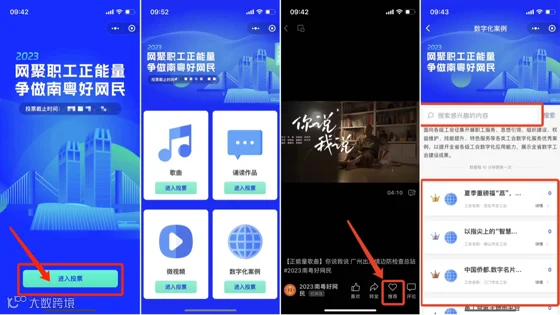即日起至9月17日23点,广大网友可点击下方“粤会投”小程序进入投票页,每人每天最多可以选择3个数字化案例投票。而歌曲、诵读、微视频三个子项目每人可以为同一作品投票1次,不限投票的作品数量,爱心数量即投票票数。
