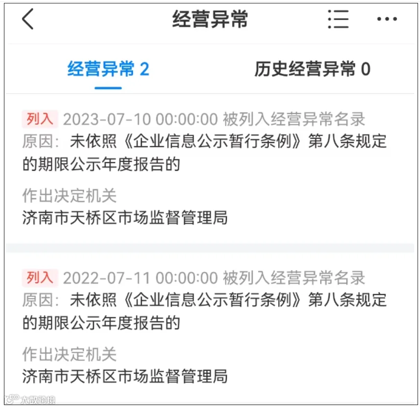 2022年、2023年,山东蓝翔教育科技集团有限公司因未按规定期限公示年报,已两次被济南市天桥区市场监督管理局列入经营异常名录。