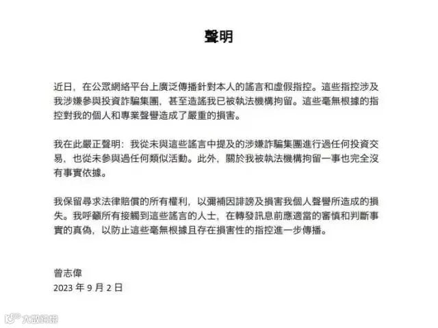 声明指出,近日,网络平台上广泛传播针对曾志伟的谣言和虚假指控,涉及曾志伟涉嫌参与投资诈骗集团,甚至造谣已被执法机构拘留。曾志伟严正声明,从未与这些谣言中提及的涉嫌诈骗集团进行过任何投资交易,也从未参与过任何类似活动。此外,关于曾志伟被执法机构拘留一事也完全没有事实依据。他保留寻求法律赔偿的所有权利,以弥补因诽谤及损害个人声誉所造成的损失。