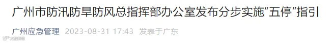 一、停课指引。广州市教育局通知受影响范围内的中小学、幼儿园、托儿所、托管机构和中等职业学校于9月1日开始停课,2023年秋季开学时间延迟至9月4日,已返校的普通高中学生由学校严格做好校内安全管理等工作。番禺、南沙区高等院校和培训机构根据市教育局和市人力资源和社会保障局要求于9月1日17时前做好停课和管理工作。