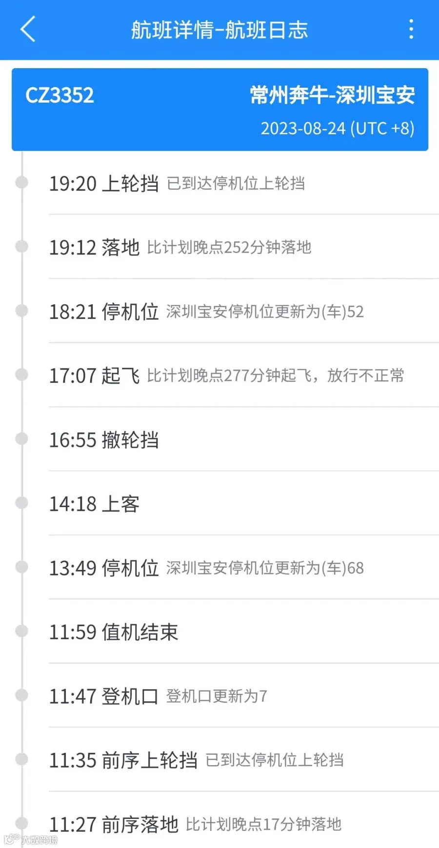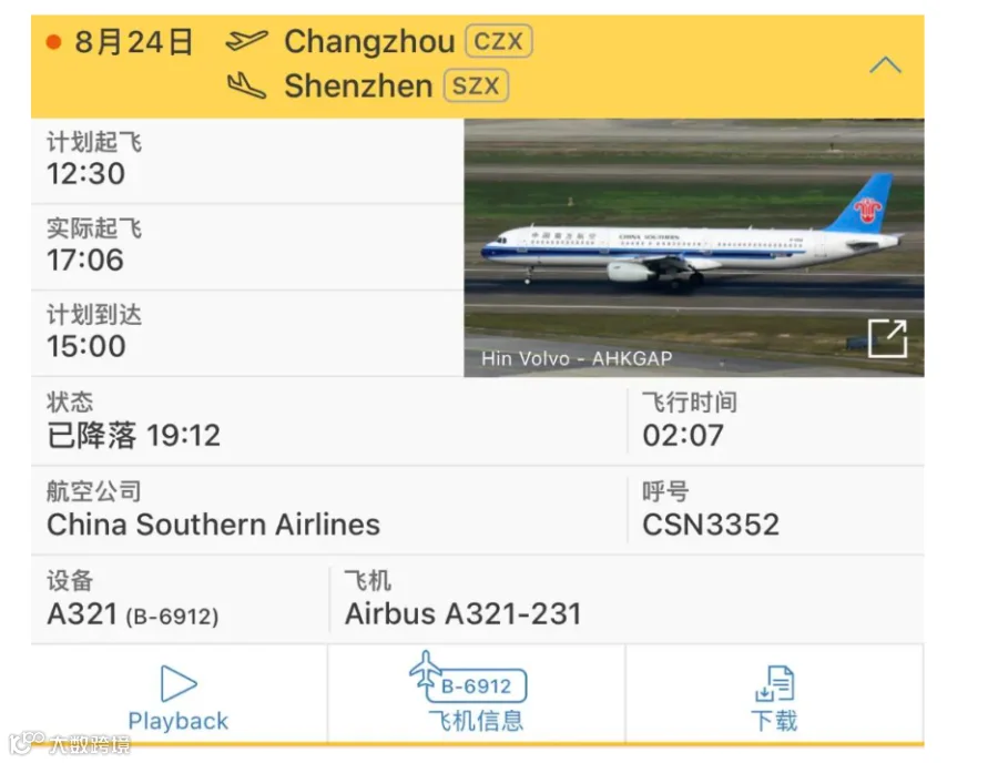 据南方航空官网显示,CZ3352次航班每日12:30从常州奔牛国际机场起飞,15:10到达深圳。据航空专业软件“飞常准”显示,8月24日的CZ3352次航班11:27前序航班落地,14:18开始上客,16:55撤轮挡,17:07起飞。