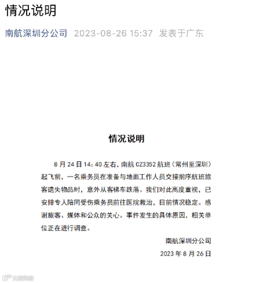 今天(8月26日)下午,南方航空深圳分公司发布最新情况说明:受伤