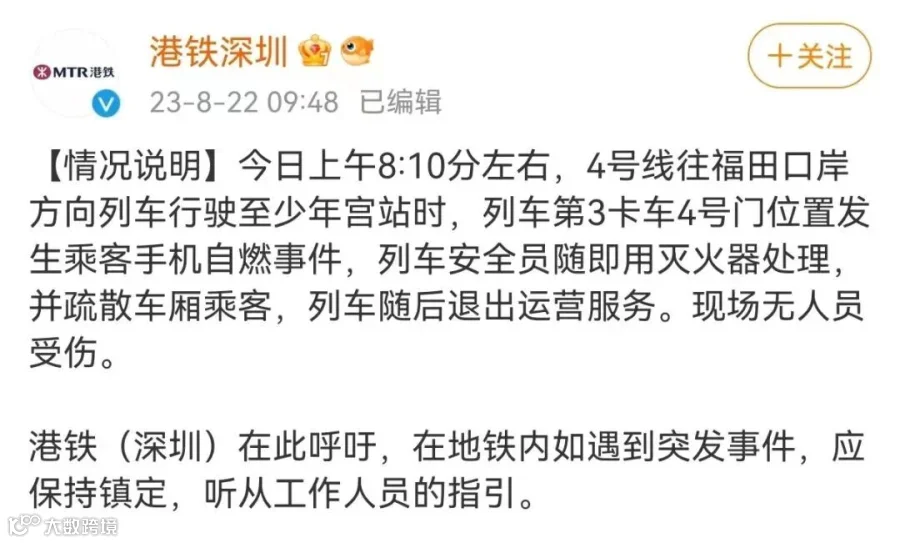 8月22日上午8时10分左右,地铁4号线往福田口岸方向列车行驶至少年宫站时,列车第3卡车4号门位置发生乘客手机自燃事件,列车安全员随即用灭火器处理,并疏散车厢乘客,列车随后退出运营服务。现场无人员受伤。