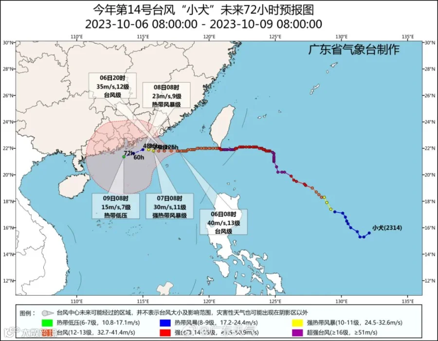 5日夜间-6日,台湾海峡、巴士海峡、南海东北部海面平均风10~12级、阵风13级,粤东海面风力逐渐加大到8~10级,其中台风中心经过的附近海域旋转风12~14级;7-8日,粤东、珠江口外海面、南海北部海面东北风8~9级,其中台风中心经过的附近海域旋转风9~11级,粤西海面东北风6~7级。