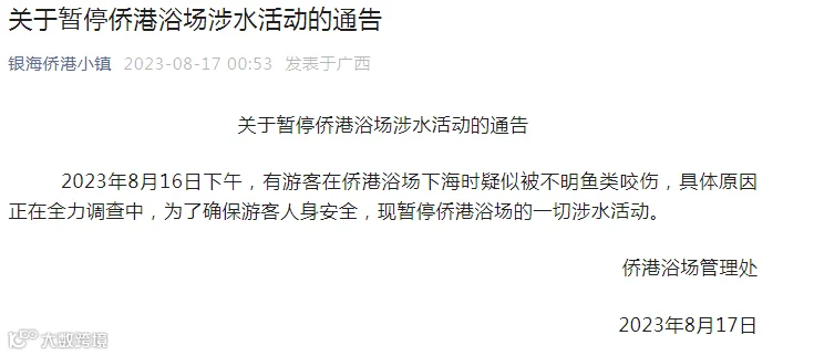 通报称,2023年8月16日下午,有游客在侨港浴场下海时疑似被不明鱼类咬伤,具体原因正在全力调查中,为了确保游客人身安全,现暂停侨港浴场的一切涉水活动。