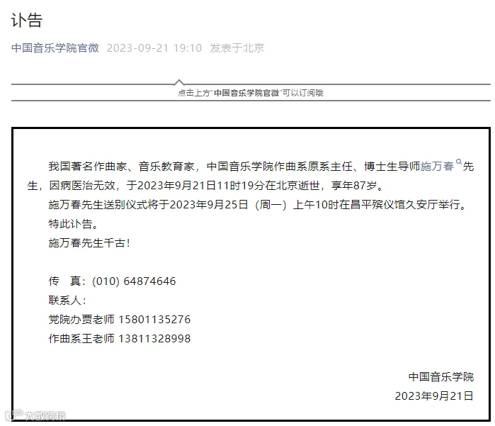 昨日(9月21日),据中国音乐学院官微消息,我国著名作曲家施万春因病医治无效,于9月21日上午在北京逝世,享年87岁。