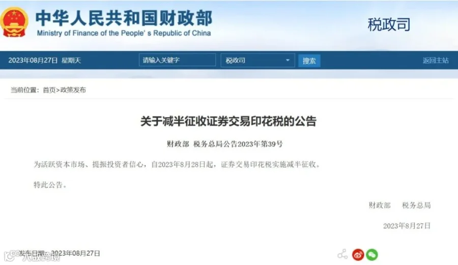 8月27日,财政部、税务总局发布公告:为活跃资本市场、提振投资者信心,