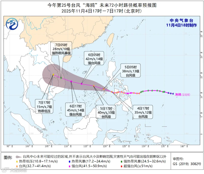 中央气象台11月4日18时继续发布台风蓝色预警。今年第25号台风“海鸥”的中心今天(4日)17时位于菲律宾苏禄海北部海面,就是北纬10.9度、东经121.3度,中心附近最大风力有12级(35米/秒),中心最低气压为970百帕,七级风圈半径200-280公里,十级风圈半径100至120公里,十二级风圈半径40公里。