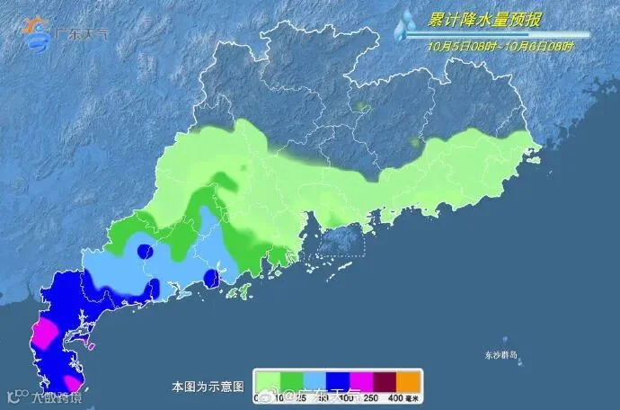 4日夜间-5日夜间,珠江口以西的沿海市县有大雨到暴雨局部大暴雨,其余大部分市县多云,有(雷)阵雨。最高气温:粤西市县28~30℃,其余大部分市县30~33℃。