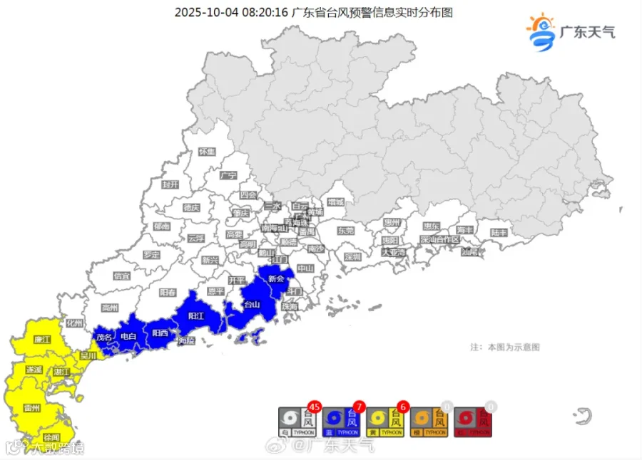 在湛江市区发布台风黄色预警信号的同时,湛江范围内的雷州、廉江、遂溪、吴川,亦升级台风黄色预警信号;连同此前已经升级台风黄色预警信号的徐闻,湛江全市均已发布台风黄色预警信号。
