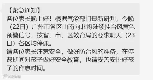 今晚(9月22日),广州多区学校收到停课通知。记者从广州市教育局了解到,通知属实,将发正式通报。