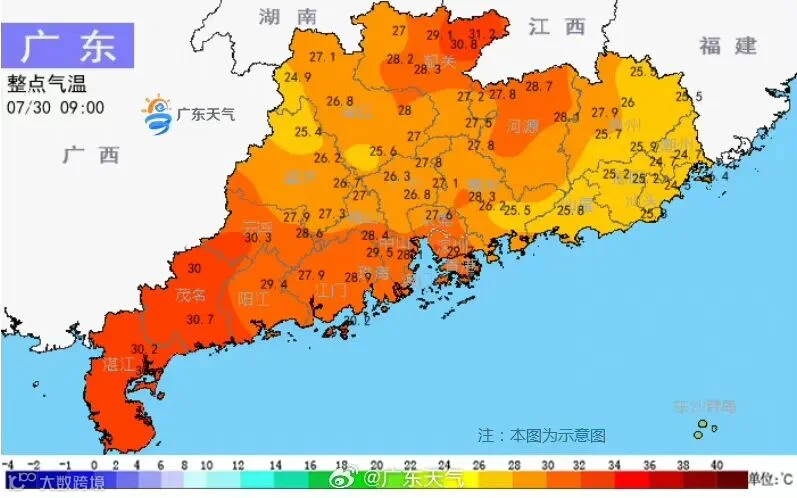 预计,受偏南气流影响,30日,广东省部分市县仍有较明显雷雨;7月31日-8月1日,广东省大部多云,有分散(雷)阵雨,气温上升,天气再次转炎热。需注意局地强降水引发的次生灾害、注意防暑防晒。