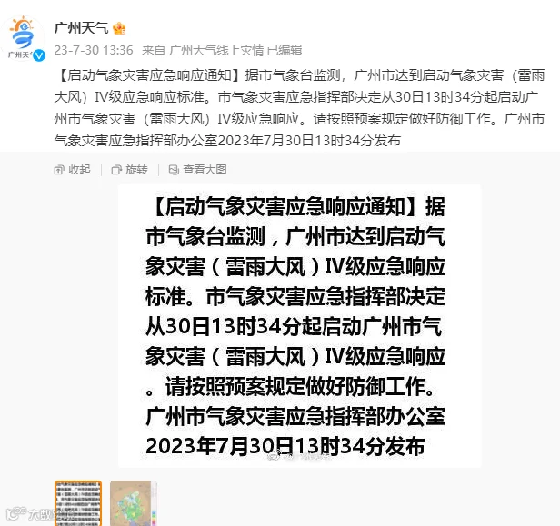 据@广州天气,7月30日13时34分,广州市气象灾害应急指挥部办公室发布消息,据市气象台监测,广州市达到启动气象灾害(雷雨大风)Ⅳ级应急响应标准。市气象灾害应急指挥部决定从30日13时34分起启动广州市气象灾害(雷雨大风)Ⅳ级应急响应。请按照预案规定做好防御工作。