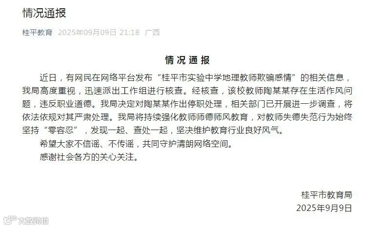 近日,有网民在网络平台发布“桂平市实验中学地理教师欺骗感情”的相关信息,我局高度重视,迅速派出工作组进行核查。经核查,该校教师陶某某存在生活作风问题,违反职业道德。我局决定对陶某某作出停职处理,相关部门已开展进一步调查,将依法依规对其严肃处理。我局将持续强化教师师德师风教育,对教师失德失范行为始终坚持“零容忍”,发现一起、查处一起,坚决维护教育行业良好风气。