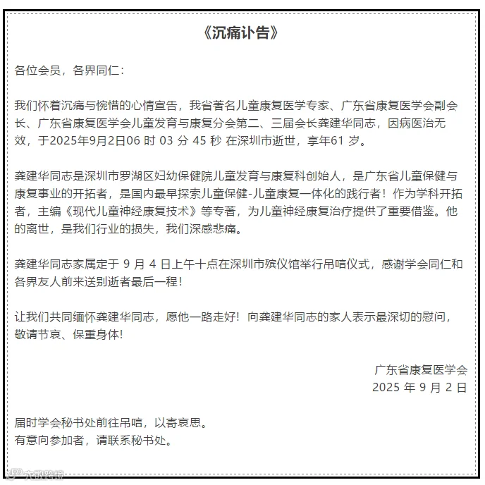 据广东省康复医学会消息,著名儿童康复医学专家、广东省康复医学会副会长、广东省康复医学会儿童发育与康复分会第二、三届会长龚建华同志,因病医治无效,于2025年9月2日上午在深圳市逝世,享年61岁。