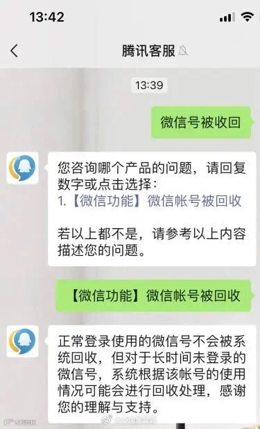 腾讯客服回应表示,正常登录使用的微信号不会被系统回收,但对于长时间未登录的微信号,系统根据该账号的使用情况可能会进行回收处理。