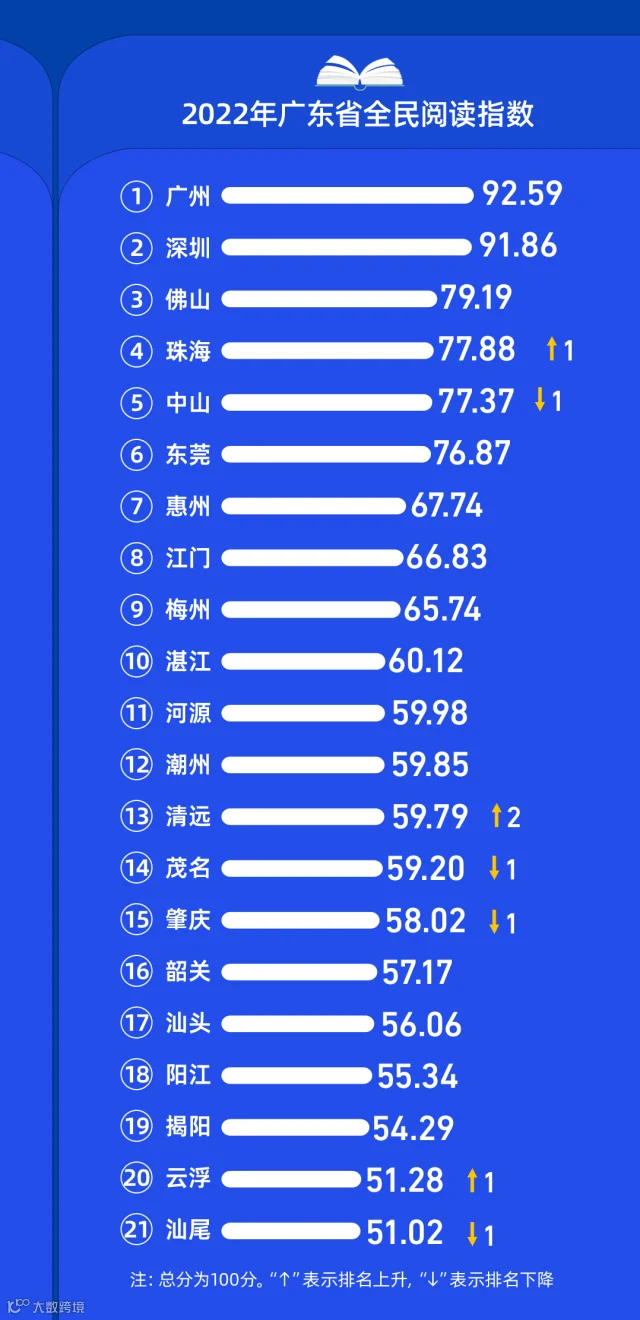 珠海、清远、云浮全民阅读指数排名有所上升。2022年,珠海排名重回第四,当地阅读消费活力较高,阅读氛围评价全省第一。清远的市级公共图书馆人均阅读资源较往年增加,居民到馆阅读的热情也有所提高,整体排名回升2位。