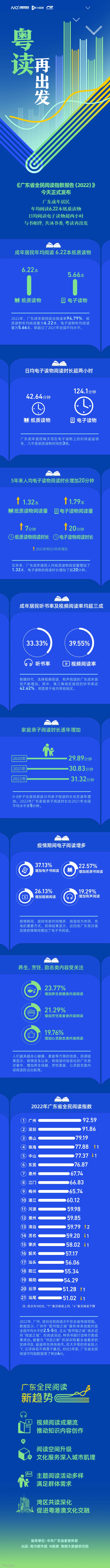 平均到每天,广东成年居民花42.64分钟阅读纸质书,而电子读物的阅读时长达到124.1分钟。相比5年前,纸质读物人年均阅读量增多1.32本,电子阅读日均时长增加了20.3分钟。