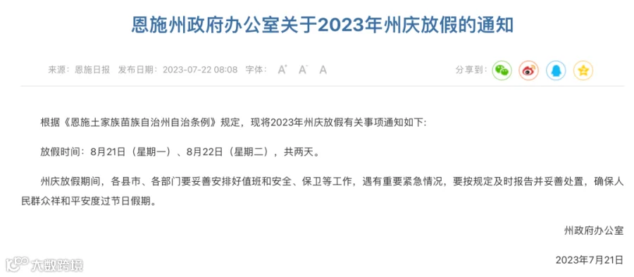 此前,7月21日,恩施州政府办公室就已发布州庆的放假通知。《通知》称,根据《恩施土家族苗族自治州自治条例》规定,2023年州庆放假时间为8月21日(星期一)、8月22日(星期二),共2天。
