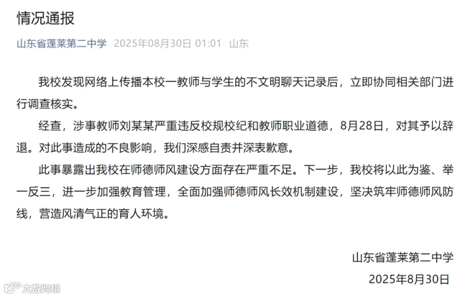 经查,涉事教师刘某某严重违反校规校纪和教师职业道德,8月28日,对其予以辞退。对此事造成的不良影响,我们深感自责并深表歉意。
