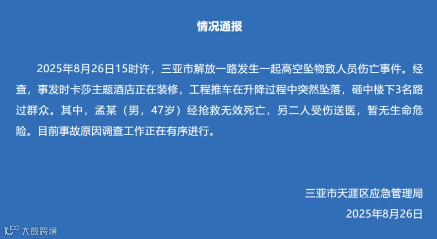 三亚市发生一起高空坠物事件,致一人死亡两人受伤。