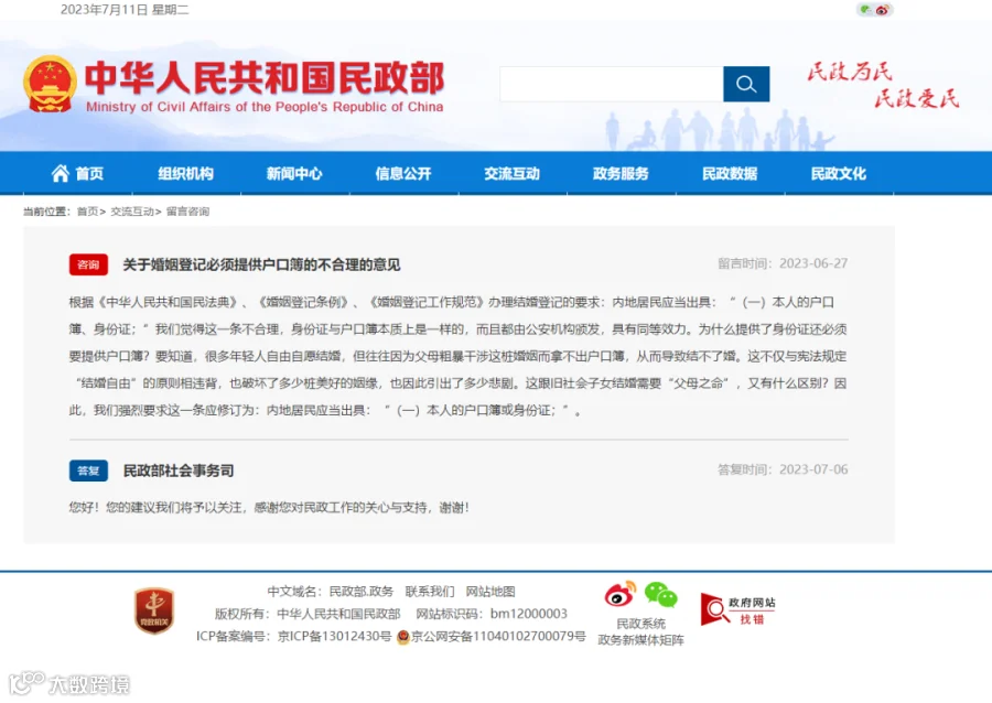 近日有网民在民政部网站留言称
