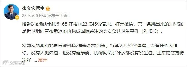 搭乘深夜航班MU5165 在夜间23点45分落地,打开微信,第一条跳出来的消息就是世卫组织宣布新冠不再构成国际关注的突发公共卫生事件(PHEIC)。