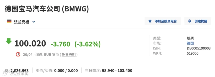 据媒体报道,截至欧洲中部夏令时间4月20日18时30分,宝马汽车公司股价收盘报100.02欧元,日内跌3.62%,市值蒸发超24亿欧元,按最新汇率换算已超过180亿元人民币。