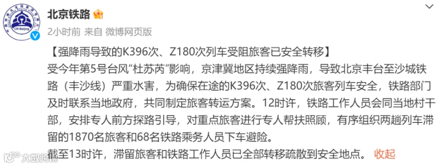 据@北京铁路,受今年第5号台风“杜苏芮”影响,京津冀地区持续强降雨,导致北京丰台至沙城铁路(丰沙线)严重水害,为确保在途的K396次、Z180次旅客列车安全,铁路部门及时联系当地政府,共同制定旅客转运方案。12时许,铁路工作人员会同当地村干部,安排专人前方探路引导,对重点旅客进行专人帮扶照顾,有序组织两趟列车滞留的1870名旅客和68名铁路乘务人员下车避险。