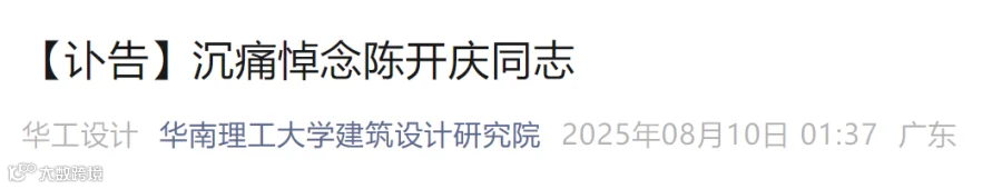 华南理工大学建筑设计研究院8月10日发布讣告:华南理工大学教授、国务院政府特殊津贴专家,西藏自治区建筑勘察设计院主要创建者、首任院长,华南理工大学建筑设计研究院原院长陈开庆同志,因病医治无效,于2025年8月8日在广州逝世,享年93岁。