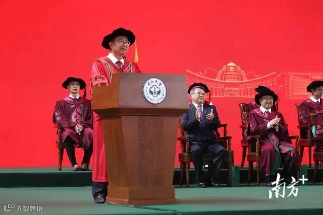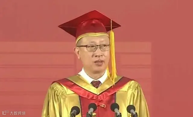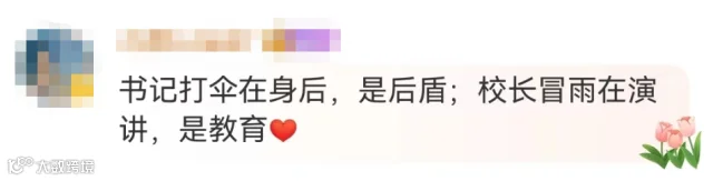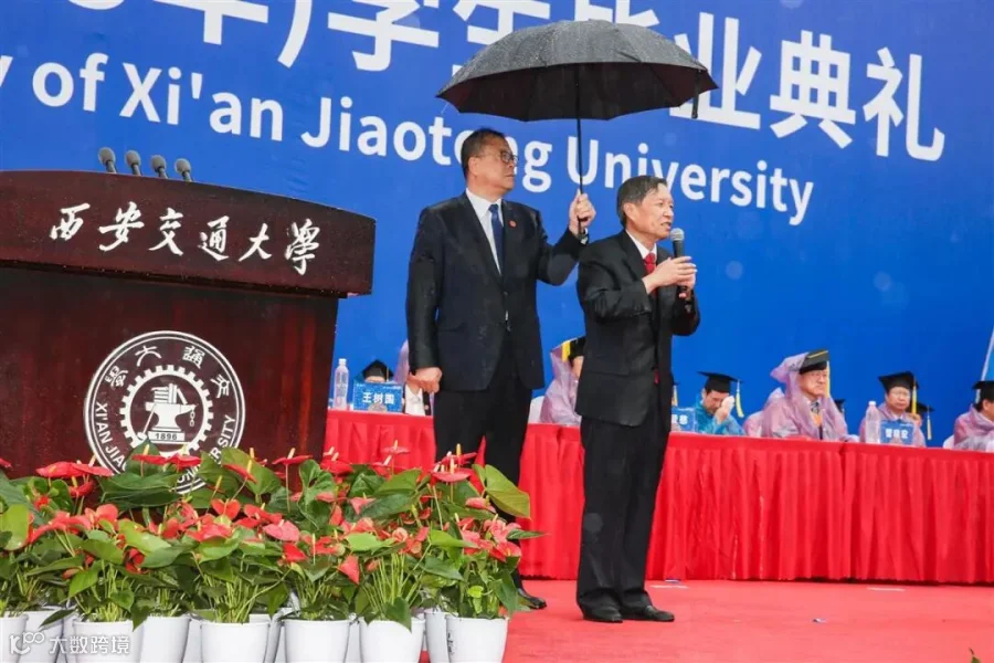 西安交大党委书记前来为校长撑伞遮雨,校长在台上客气推辞,温馨一幕引来台下暖心笑容。来源:视频截图