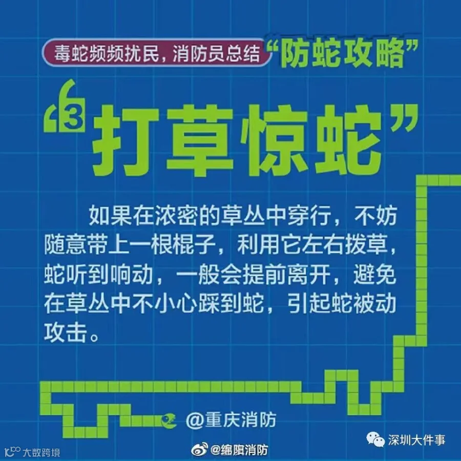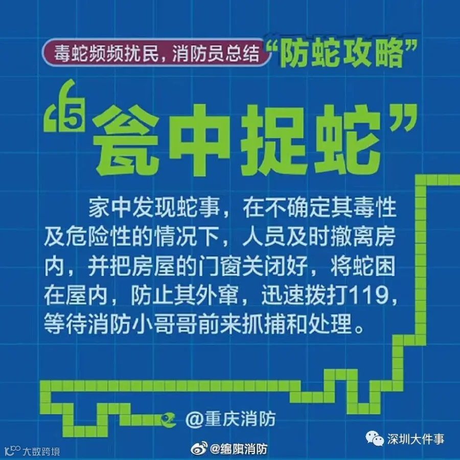 消防部门提醒广大市民,夏季雨后天气湿热,正是蛇类出没时机,尤其喜欢在阴凉潮湿地方盘踞。如果市民遇到蛇,一定保持冷静,不要私自捕捉或惊扰、挑逗它,应及时报警,以免造成不必要的伤害。
