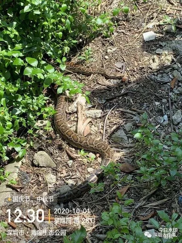 2020年10月1日下午12:30,位于深圳红树林海滨生态公园入口绿化带处,一条花色大蟒蛇正懒洋洋地趴在草地上晒太阳。