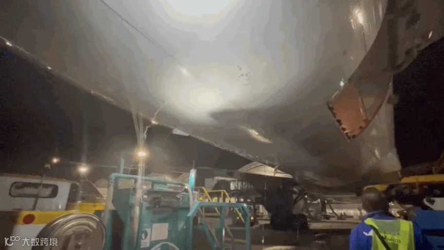 临起飞前,机组人员发现客机水箱漏水,机身多处不断滴水,部分整排渗水甚至“喷水”。