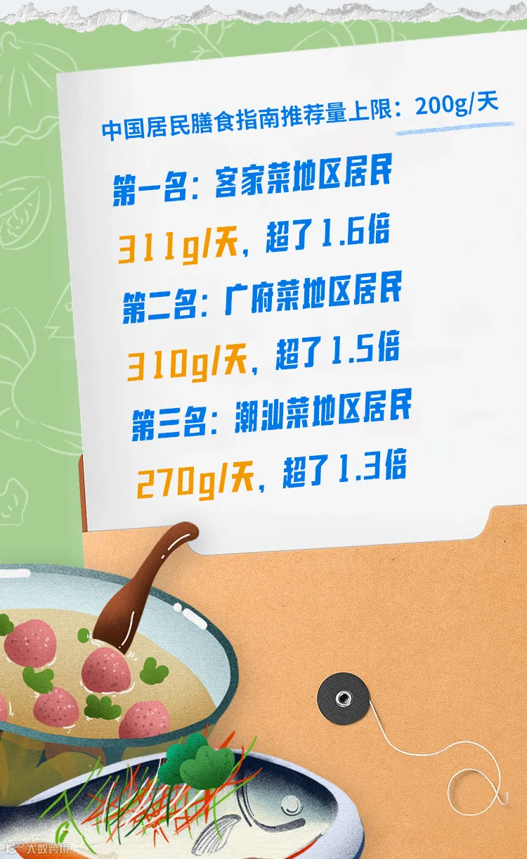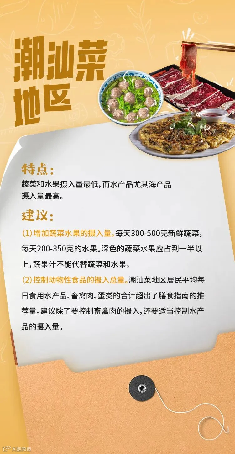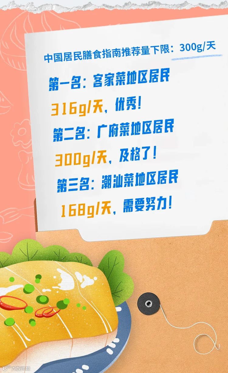 潮汕菜地区居民常吃海鱼、海虾等海产品,但蔬菜摄入量最低,远远低于推荐量下限。