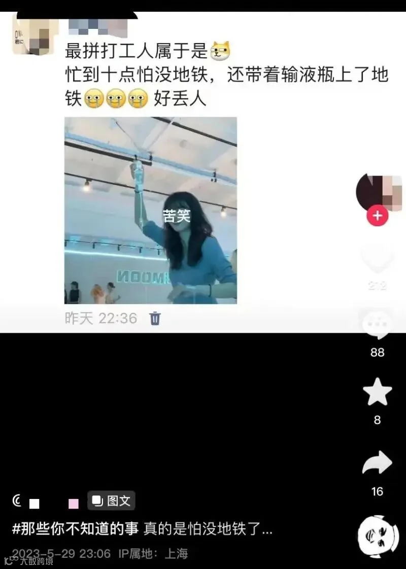 “东东”透露,因为以前从事过医护工作,之后两天她都是给自己输液,网络上流传的视频,是前天在工作室给自己输液以后赶地铁的画面。她住的地方距离市区20多公里,当时不想浪费钱打车,也不想浪费药水,又不是很清楚地铁到几点结束,夜里怕赶不上,于是举着吊瓶直奔地铁站。