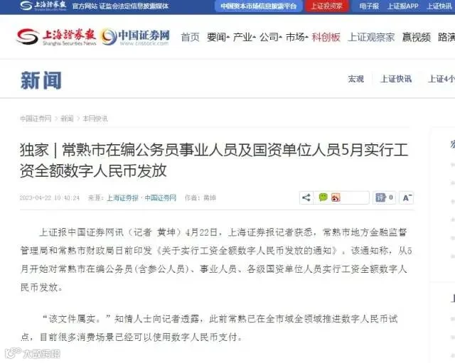 4月22日,据上海证券报报道,江苏省常熟市地方金融监督管理局和常熟市财政局日前印发《关于实行工资全额数字人民币发放的通知》。该通知称,从5月开始对常熟市在编公务员(含参公人员)、事业人员、各级国资单位人员实行工资全额数字人民币发放。