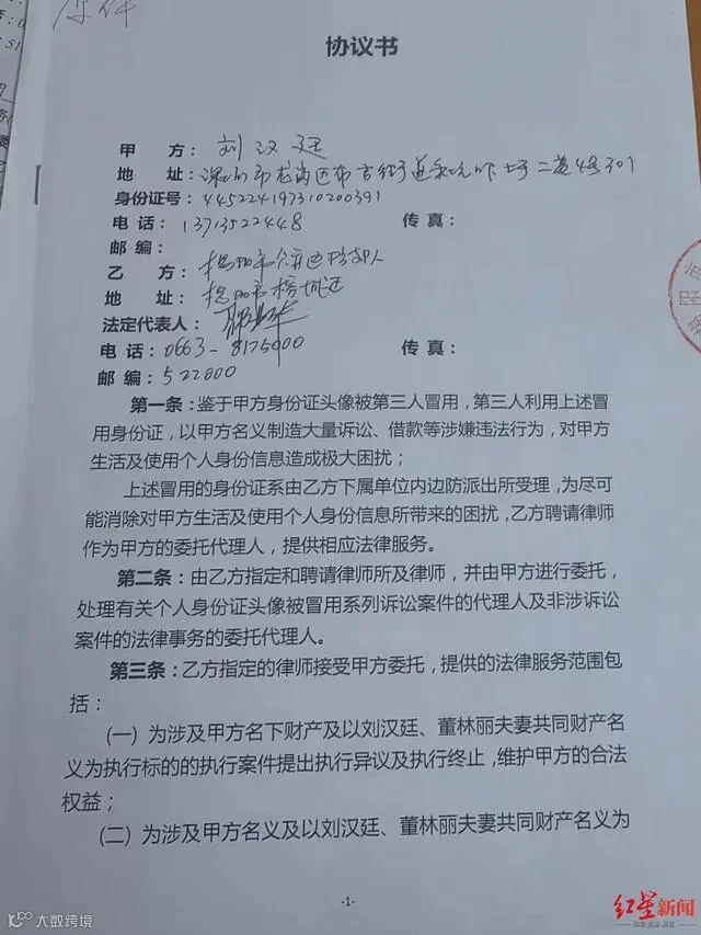 刘汉廷向记者出示了当时签署的协议,根据这份协议规定,由揭阳市公安局指定和聘请律师所和律师,负责为涉及刘汉廷名下财产及以刘汉廷、董林丽夫妻共同财产名义为执行标的的执行案件提出执行异议及执行终止,维护甲方的合法权益等事项。