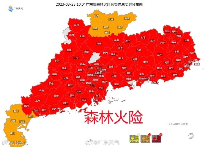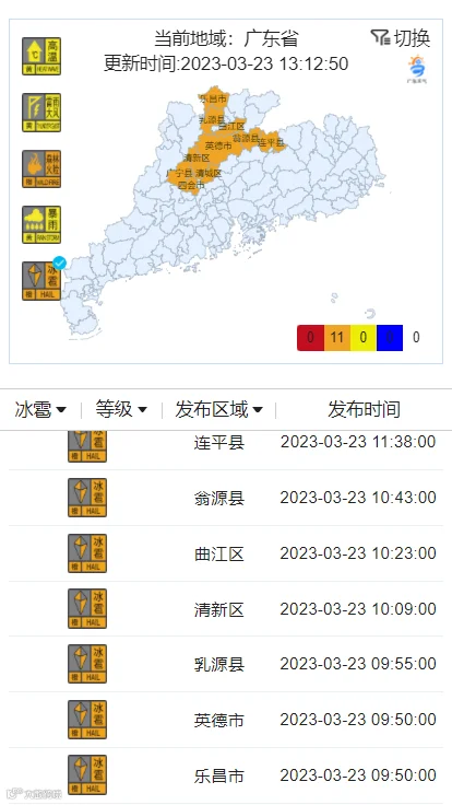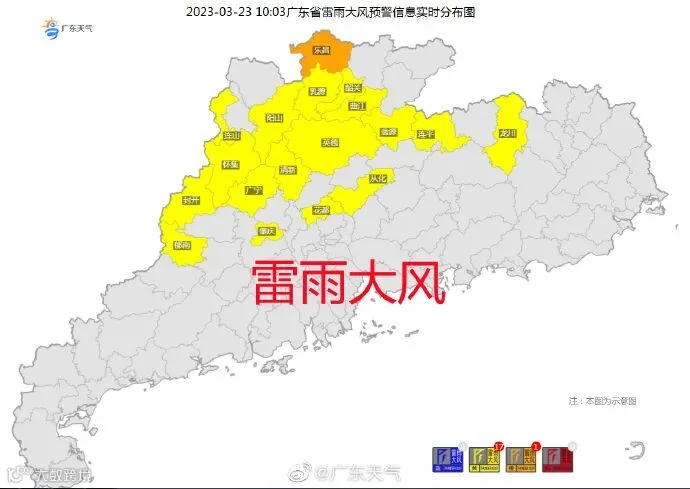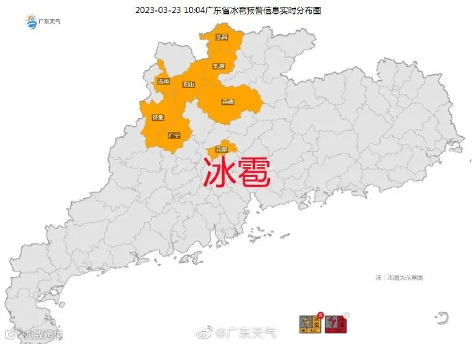 23日,清远、韶关、肇庆、云浮等市县有大雨到暴雨局部大暴雨,部分市县伴有8级局地10级雷暴大风、冰雹等强对流天气;其余市县阴天间多云有分散(雷)阵雨局部大雨。