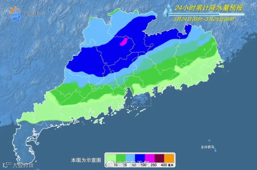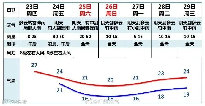 24日,粤北、珠三角中北部有大雨到暴雨局部大暴雨,粤西市县(雷)阵雨转大雨局部暴雨,其余市县阴天,有(雷)阵雨局部大雨;部分市县伴有8级局地10级雷暴大风、冰雹等强对流天气。自北向南各地气温先后下降。白天最低气温:韶关和清远的北部市县14℃~17℃,南部市县22℃~24℃,其余市县18℃~22℃。
