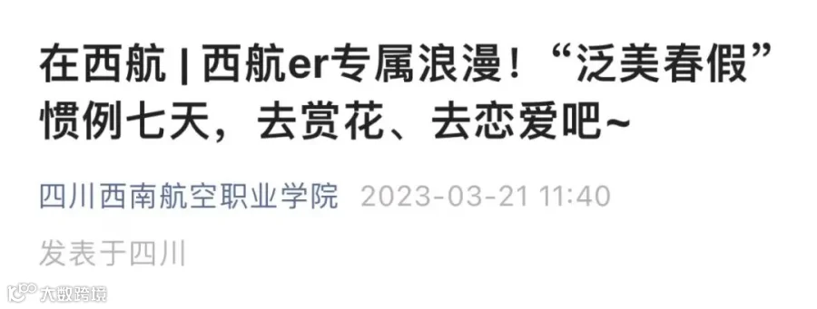 与四川西南航空职业学院同属泛美教育集团旗下的绵阳飞行职业学院、青岛航空科技职业学院等院校,也从4月1日至7日放7天“春假”。