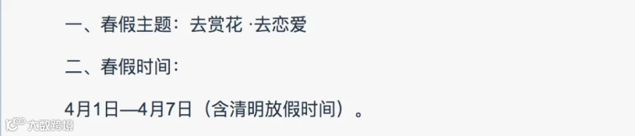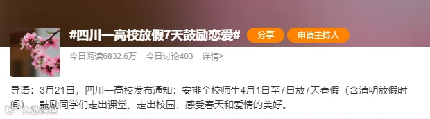据悉,这是该校例行春假制度。据成都商报消息,该通知意在鼓励同学们走出课堂、走出校园,去接触大自然,感受春天和爱情的美好。