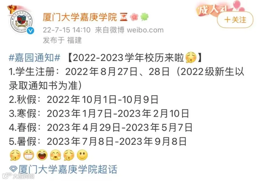 厦门大学嘉庚学院除了春假,还有秋假,2023年春假时间为4月29日—5月7日。