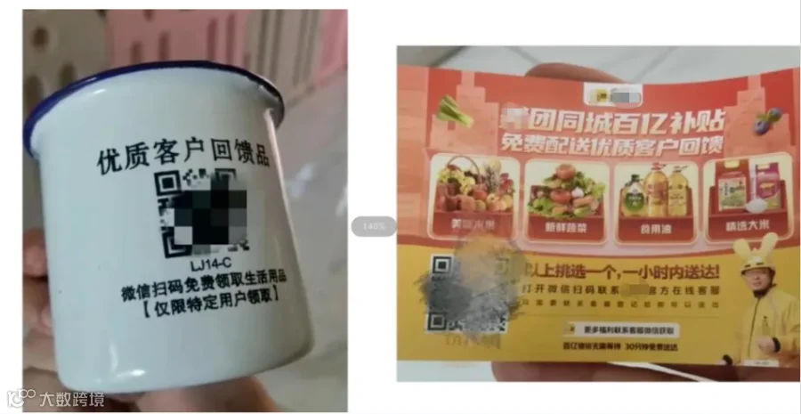 最近,住在深圳坪山区的王先生收到了一个快递,里面是一个刻有二维码的水杯,王先生出于好奇,扫了一下杯子上的二维码,出现一个客服聊天画面,客服提示他,只要确认家庭地址,然后再扫码进微信群,就会再送他一袋大米。按照客服指引,一个小时后,王先生真的收到了同城快递送来的大米。