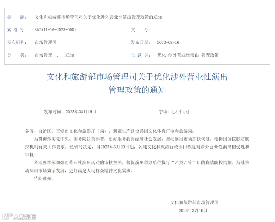 通知称,为贯彻落实党中央、国务院决策部署,更好服务经济社会发展,推动演出市场加快恢复,文化和旅游部今天印发“关于优化涉外营业性演出管理政策的通知”,根据国务院联防联控机制有关工作要求,决定自2023年3月20日起,各地文化和旅游行政部门恢复对涉外营业性演出的受理和审批。