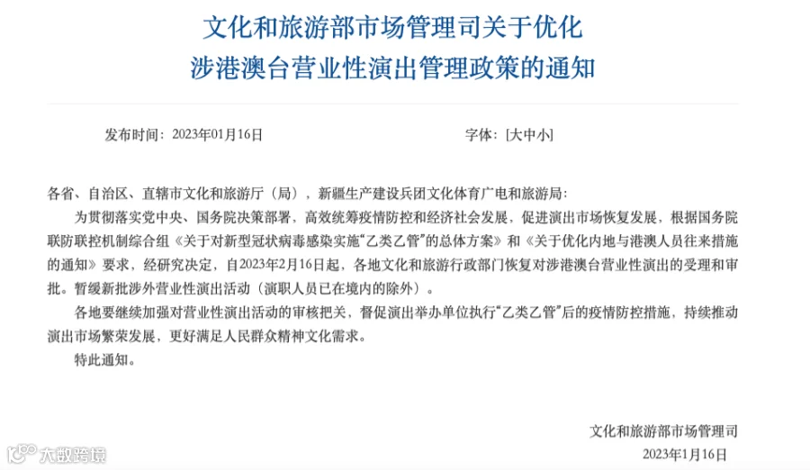 1月16日,文化和旅游部市场管理司发布通知,根据国务院联防联控机制综合组《关于对新型冠状病毒感染实施“乙类乙管”的总体方案》和《关于优化内地与港澳人员往来措施的通知》要求,自2023年2月16日起,各地文化和旅游行政部门恢复对涉港澳台营业性演出的受理和审批。暂缓新批涉外营业性演出活动(演职人员已在境内的除外)。