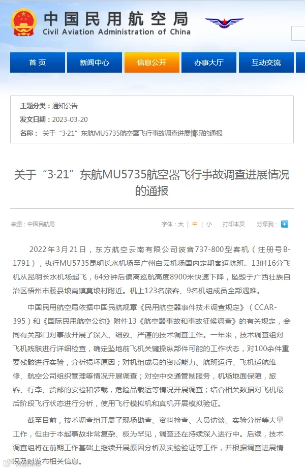 关于“3·21”东航MU5735航空器飞行事故调查进展情况的通报
