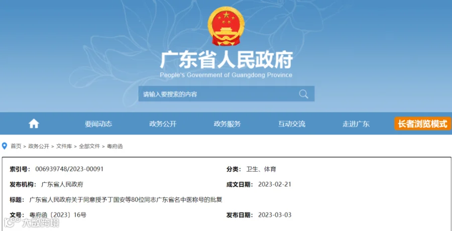 广东省人民政府公布了第五届广东省名中医名单,同意授予丁国安等80位同志广东省名中医称号并颁发荣誉证书。