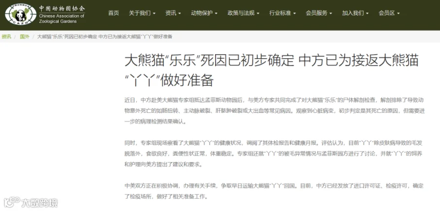 中国动物园协会官网日前发布最新消息:近日,中方赴美大熊猫专家组抵达孟菲斯动物园后,与美方专家共同完成了对大熊猫“乐乐”的尸体解剖检查,解剖排除了导致动物意外死亡的如肠扭转、主动脉破裂、肝脓肿破裂或大出血等常见病因。观察到心脏病变,初步判定是其死亡的原因,但需要进一步的病理检测结果确认。